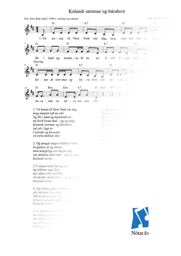 | Tekstur | Kári Bæk, týddi í 1999 e. enskum sea shantie |